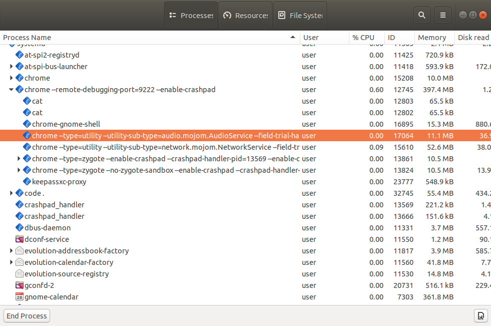 例如,您可能会看到有多个进程运行同一个浏览器程序(Firefox、Chrome、Edge 等)。 他们通常每个tab运行一个进程,再加上一些其他额外的进程。